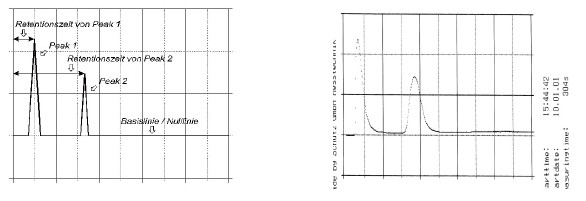 ?左圖為理想的天然氣色譜分離圖,標出的時間是停滯時間。右圖是PGC實際打印的天然氣色譜分離圖,也稱為測量結果。