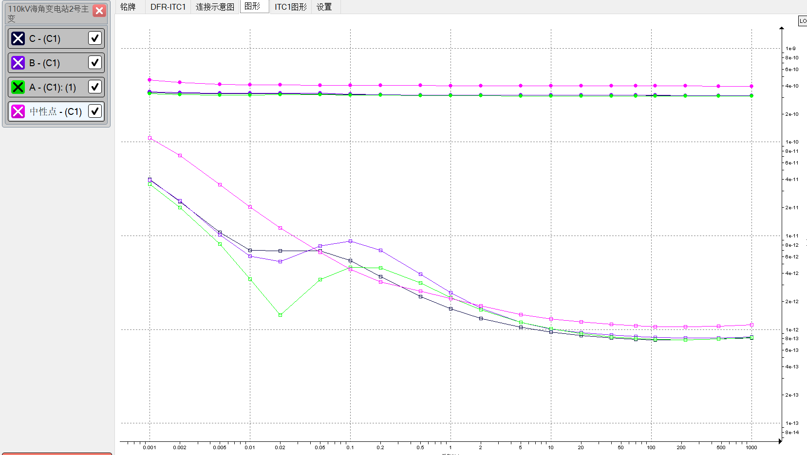 2023年9月3日,南方電網某變電站1號主變,套管FDS試驗。測試高壓側套管A相、B相、C相及中性點四根套管,ITC1測試結果顯示綠色,四根套管的絕緣性能均為新,從介損來看并無異常。
