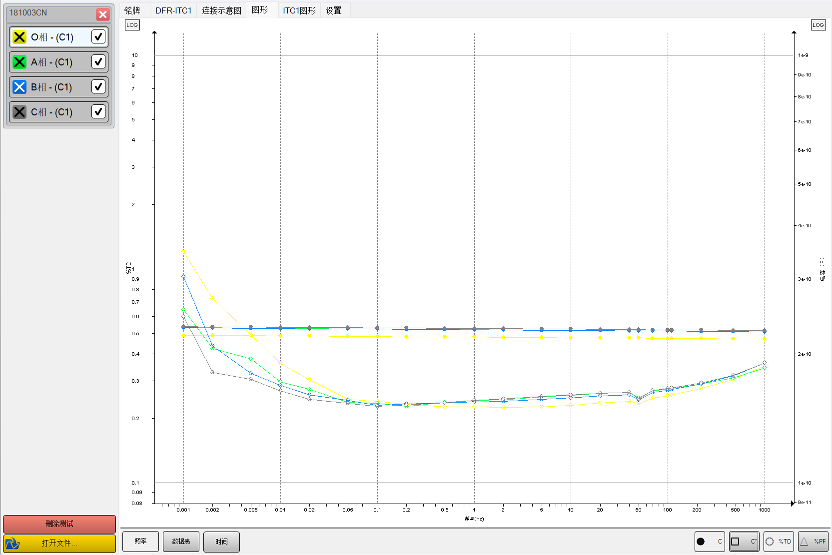 由圖中可以看到四根套管測量所得的*低點頻率均小于50Hz,表明四根套管絕緣狀態正常。(根據電力行業標準DL/T 2231-2021《油紙絕緣電力設備頻域介電譜》測試導則中5.4.3.2的判斷方法“對于套管,互感器,電力電纜等少油設備,狀態良好的絕緣局部*低介質損耗頻率點小于50Hz,絕緣較差的局部*低介質損耗頻率點高于50Hz。絕緣缺陷原因應結合其他電氣試驗和理化試驗綜合判斷。”)