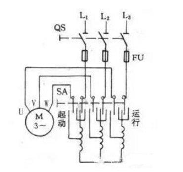 起動時,將轉換開關SA擰到“啟動”位置,此時電機定子繞組與自耦變壓器的低壓側連接,電動機降壓啟動,待轉速上升到一定值時,再將SA擰緊,電機定子繞組與自耦變壓器的低壓側連接,電機定子繞組啟動。
