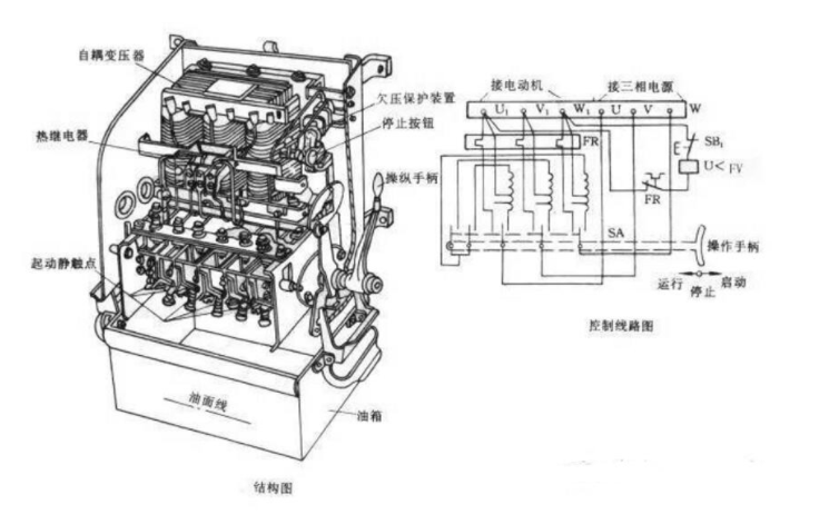采用手動控制的補償器主要有QJ3。QJ3型起動補償器結構圖和控制線路圖如下: